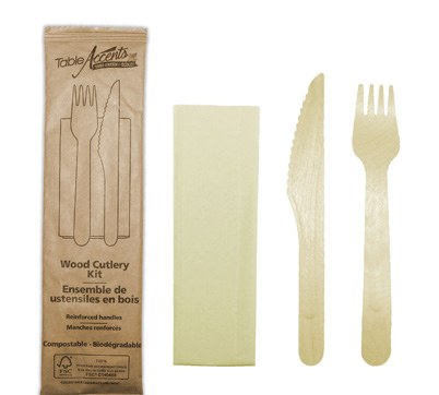 Table Accent Compostable Birch Wood 3pc Food Service Kits Fork, Knife & Napkin - 250/CS - (91631)